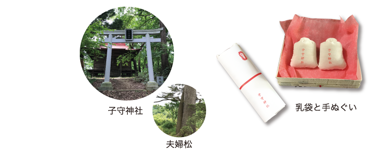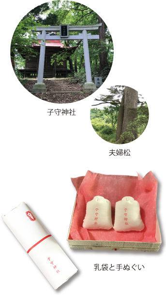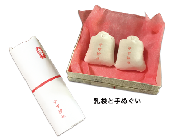 事前に祈祷予約をされた方へは「乳袋」と、子守神社の手ぬぐいを差し上げます。「乳袋」の中身は、子宝への願いを込めたお米です。日々のお食事に少しずつ混ぜることにより、神様の力を宿し子が授かり、手ぬぐいを女性が入浴の時にお使いいただくと、乳の出が良くなると伝えられています。